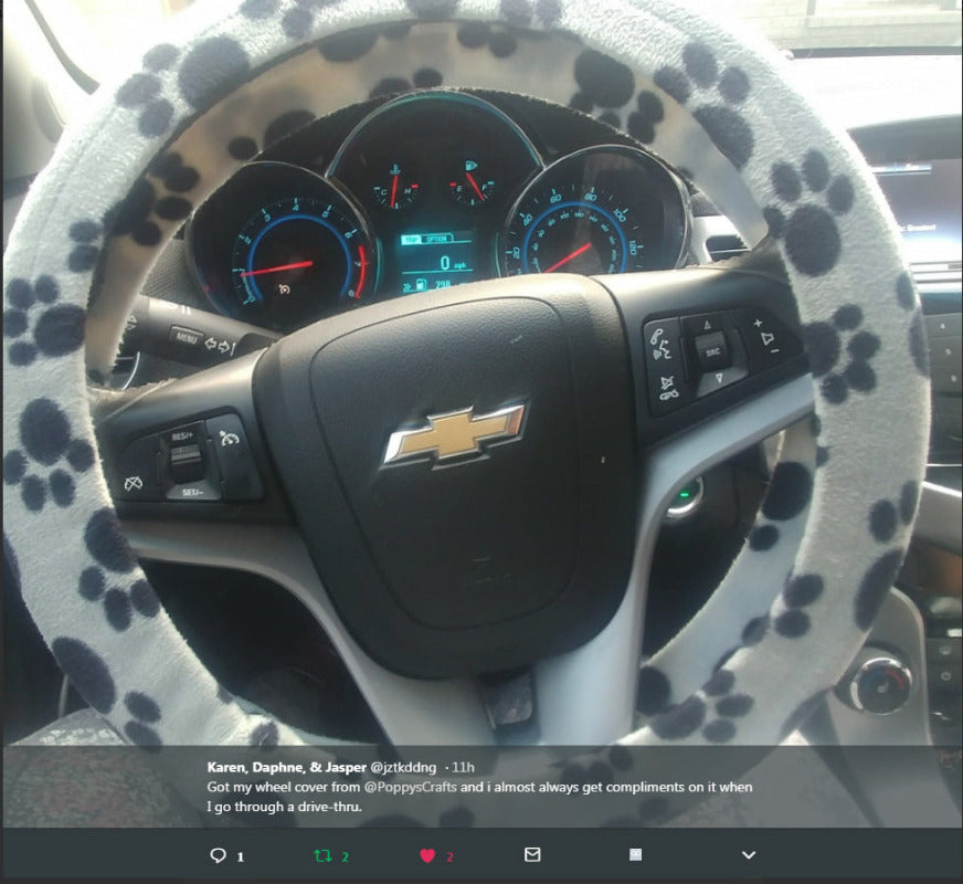 This White with Black Paws paw print fleece steering wheel cover is the purr-fect way to make your car “meow"!